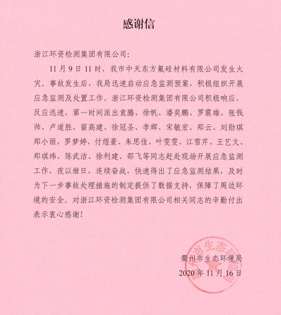 近日,浙江環(huán)資檢測集團(tuán)有限公司收到來自衢州市生態(tài)環(huán)境局的《感謝信》,感謝環(huán)資檢測集團(tuán)在11月9日本市中天東方氟硅材料有限公司發(fā)生火災(zāi)衢州市生態(tài)環(huán)境局啟動的應(yīng)急預(yù)案中,積極響應(yīng),快速反應(yīng),抽派23名精干人員夜以繼日,連續(xù)奮戰(zhàn)3天3夜,快速提供應(yīng)急監(jiān)測結(jié)果,及時(shí)為事故處理措施提供數(shù)據(jù)支持,保障周邊環(huán)境安全。對環(huán)資檢測集團(tuán)相關(guān)人員辛勤的付出表示衷心感謝!